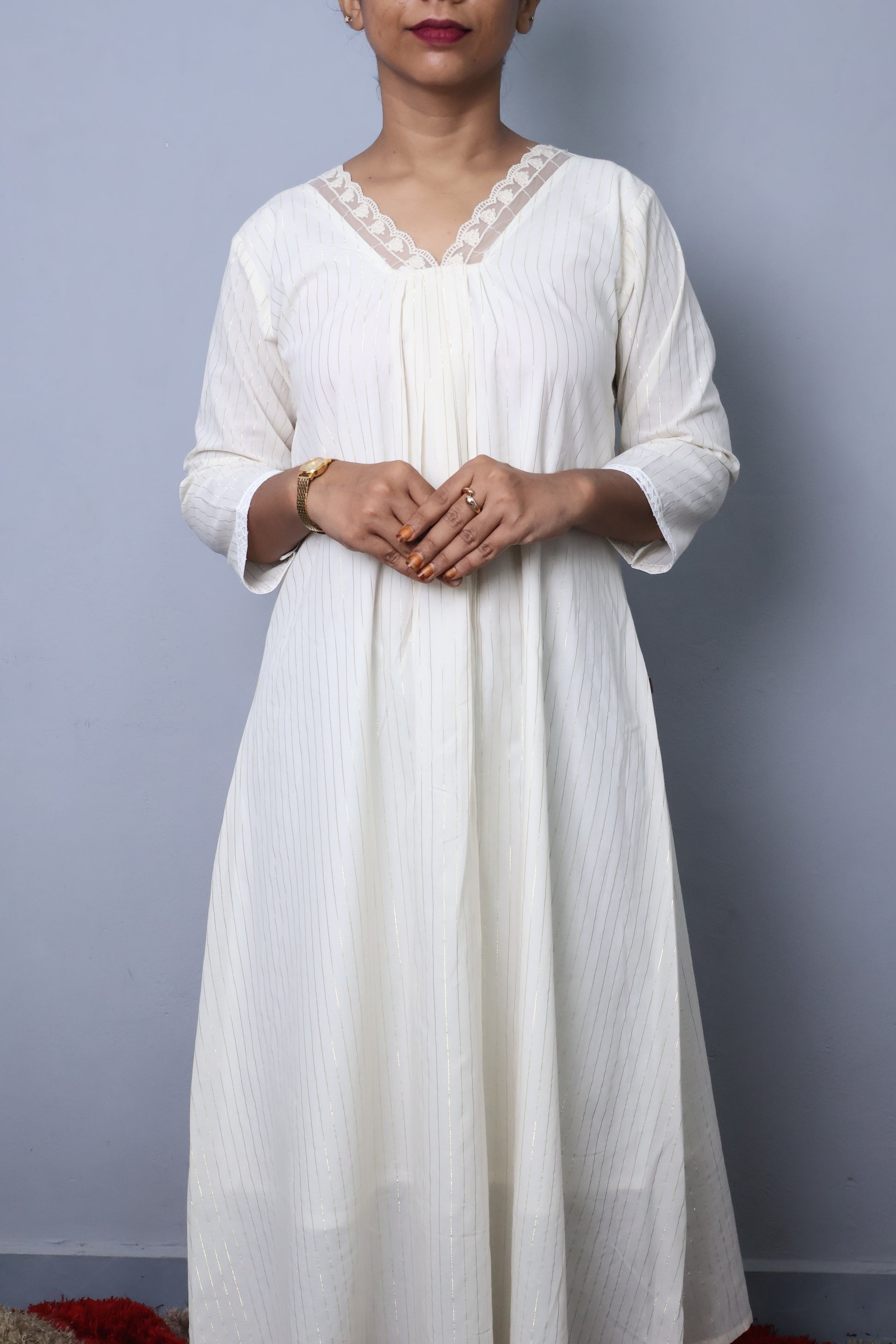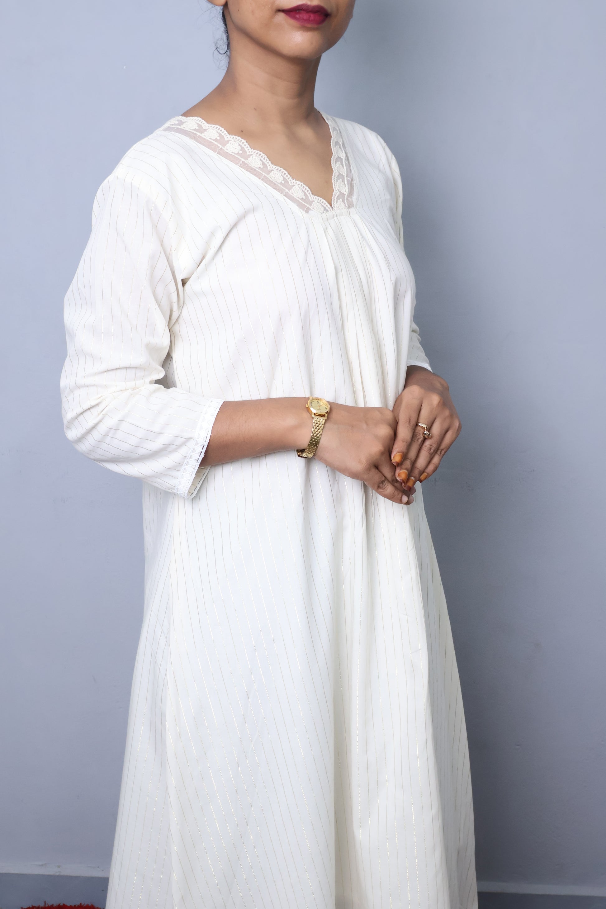 A pure white cotton kurti dress designed with a soft V-neckline and 3/4th sleeves. Its simple, elegant silhouette offers an effortlessly graceful look, ideal for casual days, work wear, or small gatherings. Crafted from breathable cotton, this dress combines comfort with understated sophistication.
