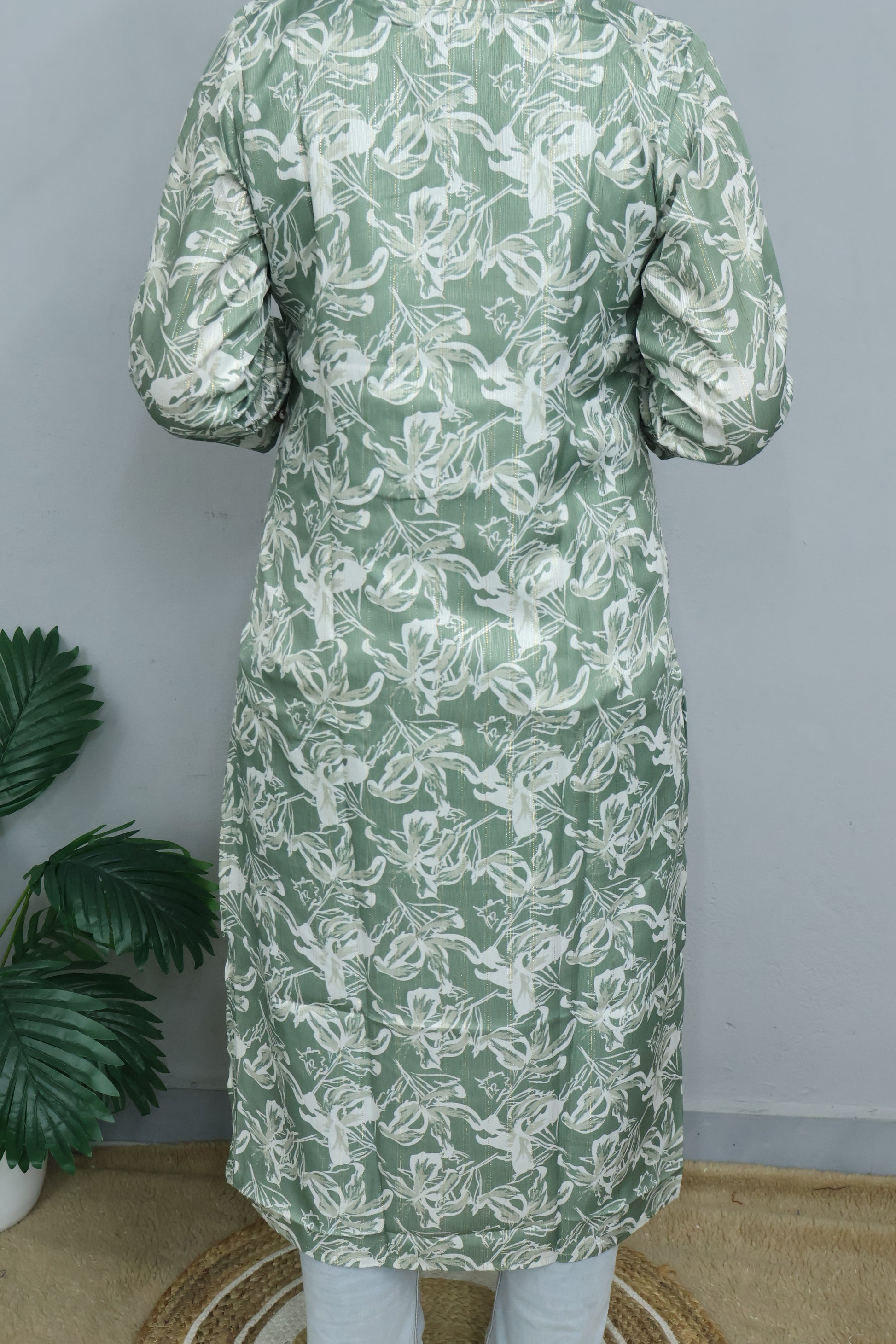 A graceful grey straight kurta featuring an all-over white floral print, designed with a notched round neckline and three-quarter sleeves. Made for everyday elegance and comfort, this outfit is ideal for office wear, casual outings, or relaxed gatherings.