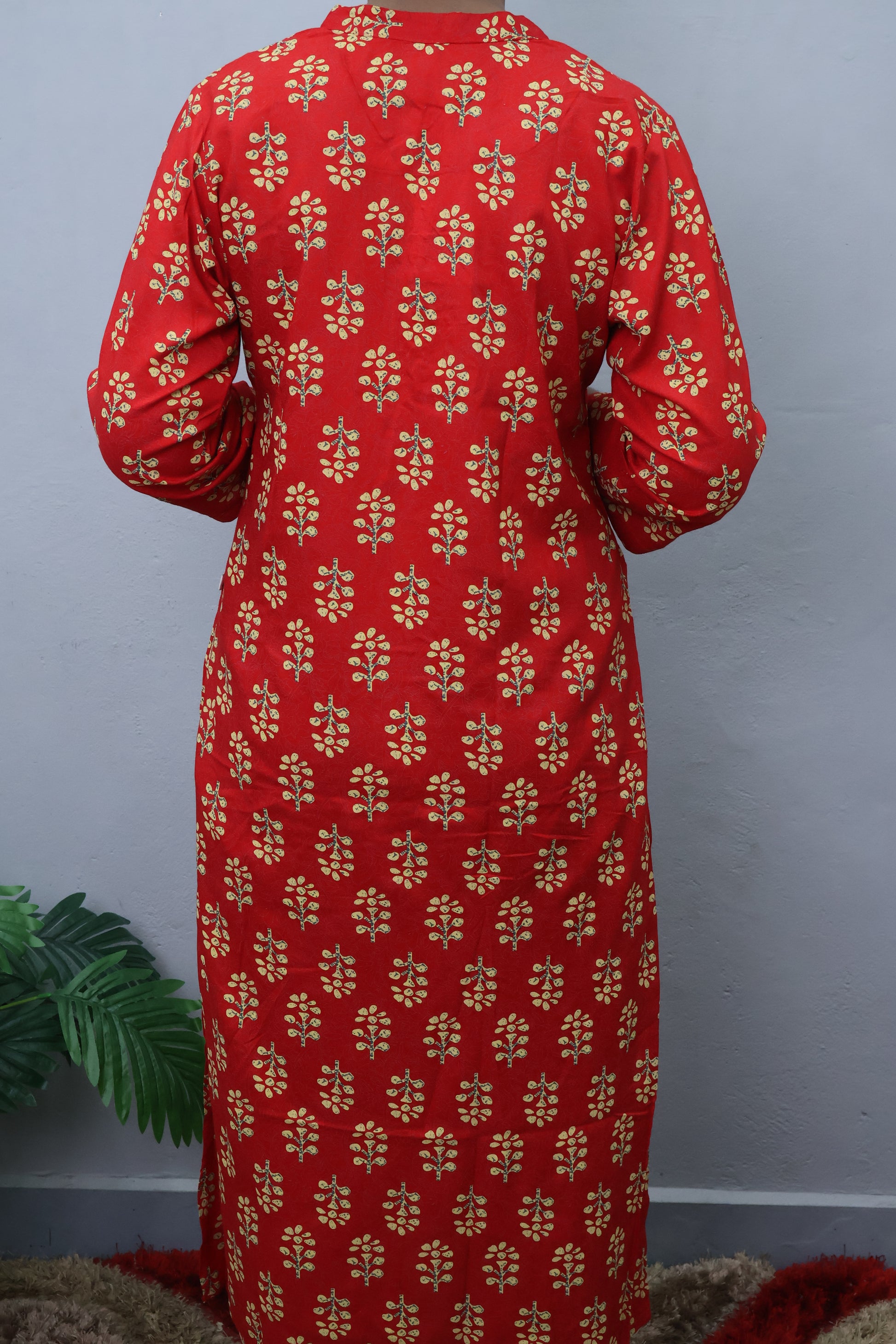 A graceful printed kurta crafted for everyday elegance and comfort. Featuring a delicate ethnic motif design, notch neckline with button accents, and a flattering straight silhouette ideal for casual gatherings, office wear, or festive days.