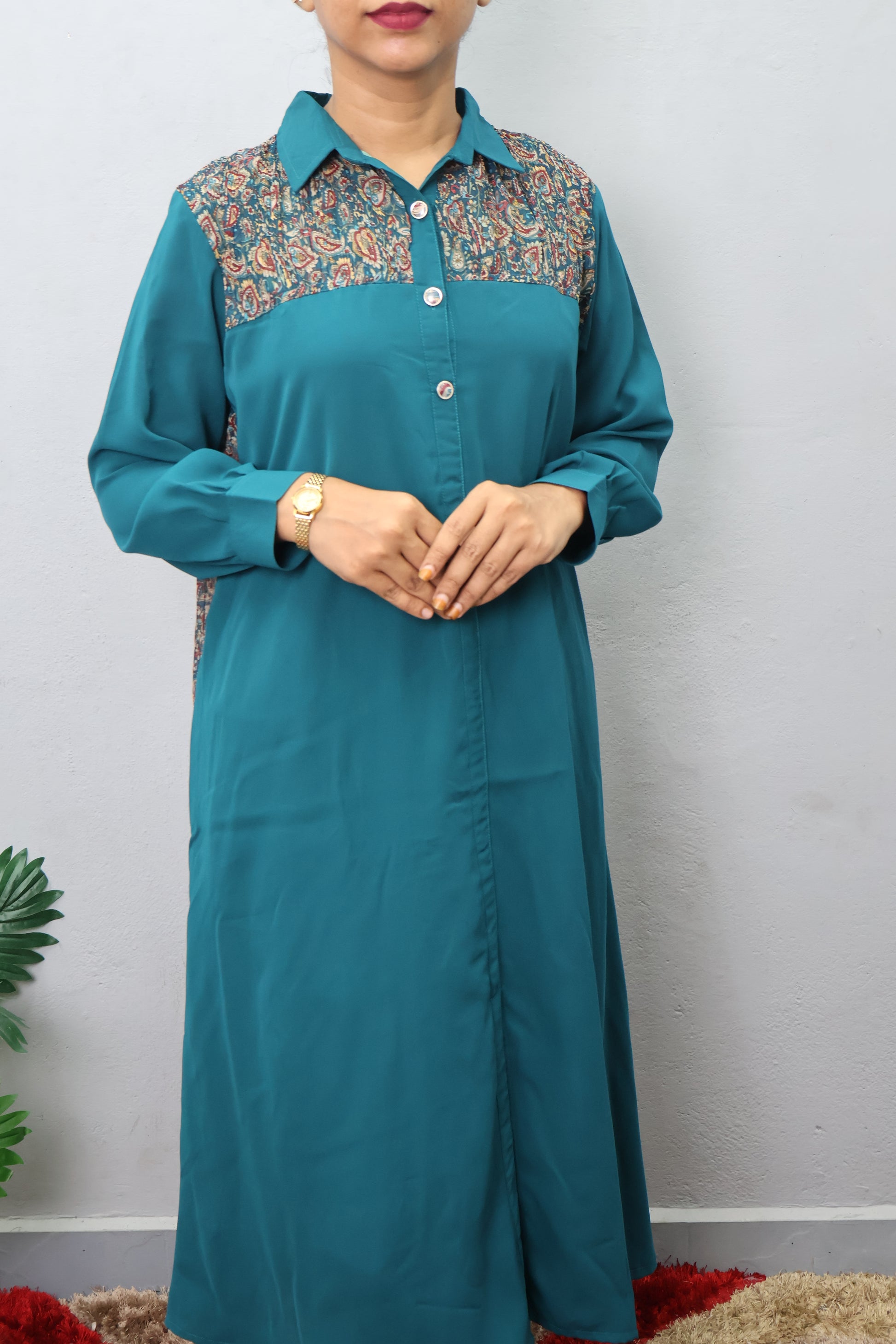 A stylish black shirt dress featuring an intricately printed yoke and collared neckline. Elegant, comfortable, and easy to style — perfect for both work wear and casual outings.