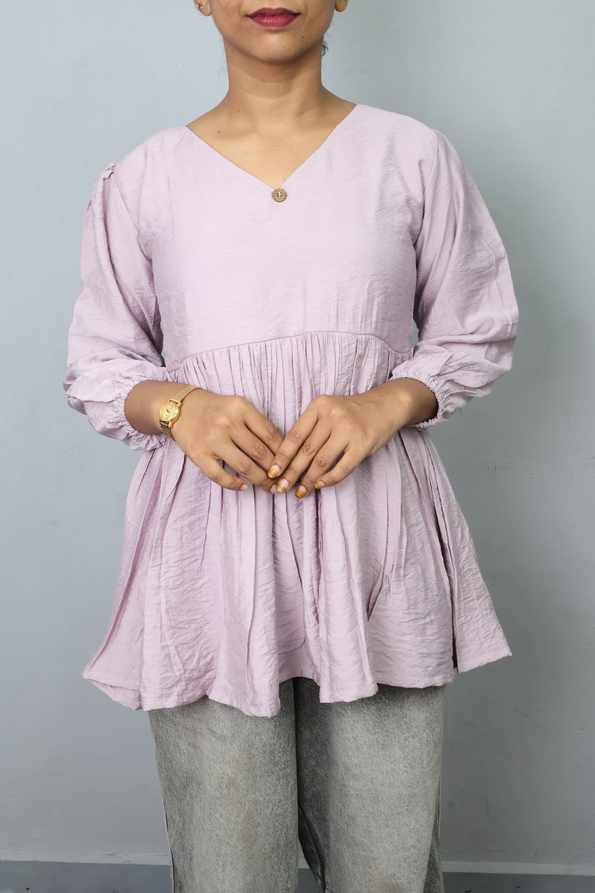A stylish flared peplum top designed with a soft crinkled texture and a relaxed silhouette. It features a flattering V-neckline with a button detail, gathered waist, and puffed sleeves for a touch of modern femininity. Perfect for casual outings, everyday wear, or a chic work-from-home look — combining comfort and effortless style.