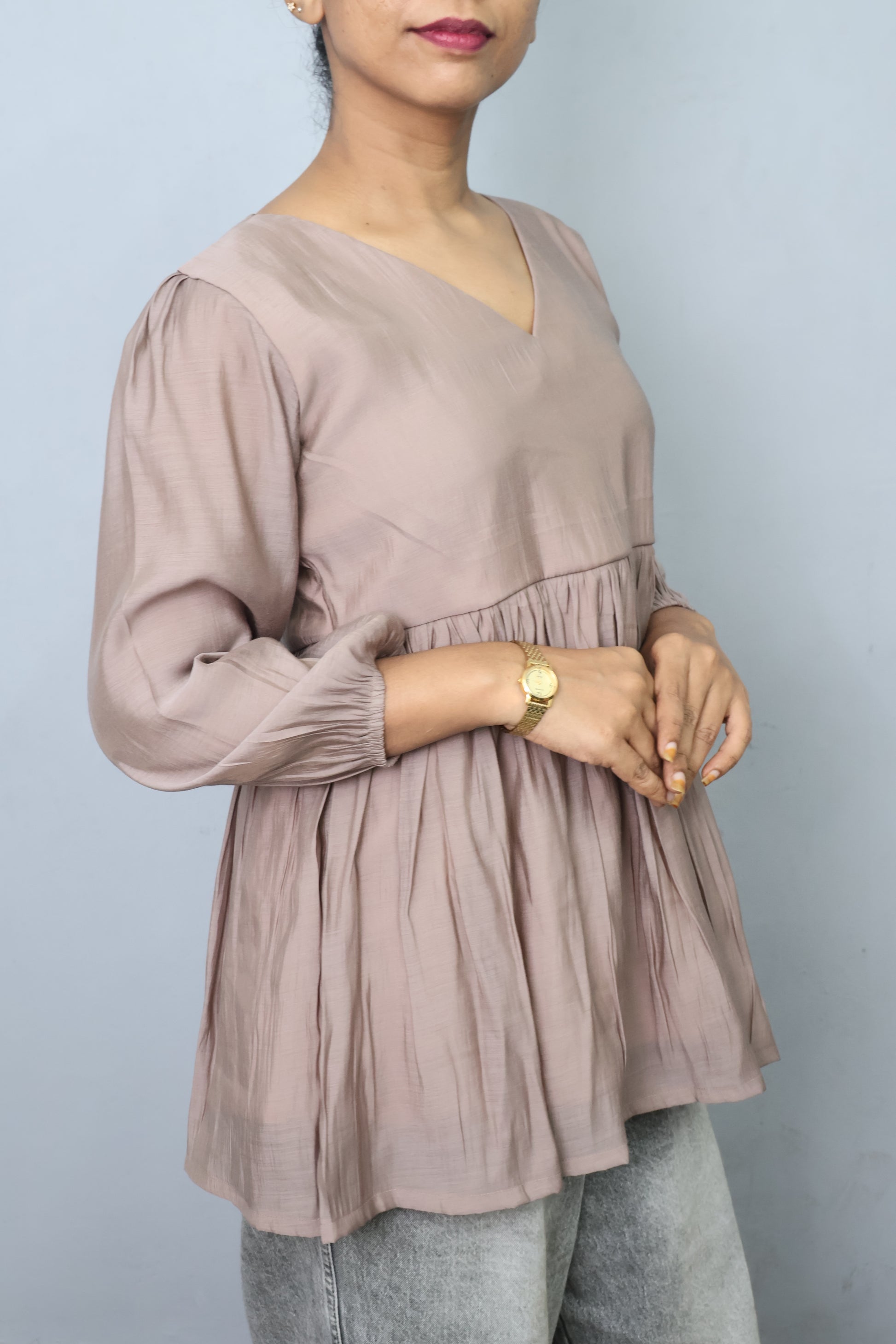 A stylish rust orange gathered tunic top designed for an elegant yet relaxed look. Featuring a flattering V-neckline, long sleeves, and a flowy silhouette that drapes beautifully — perfect for casual outings, brunch dates, or effortless everyday wear.