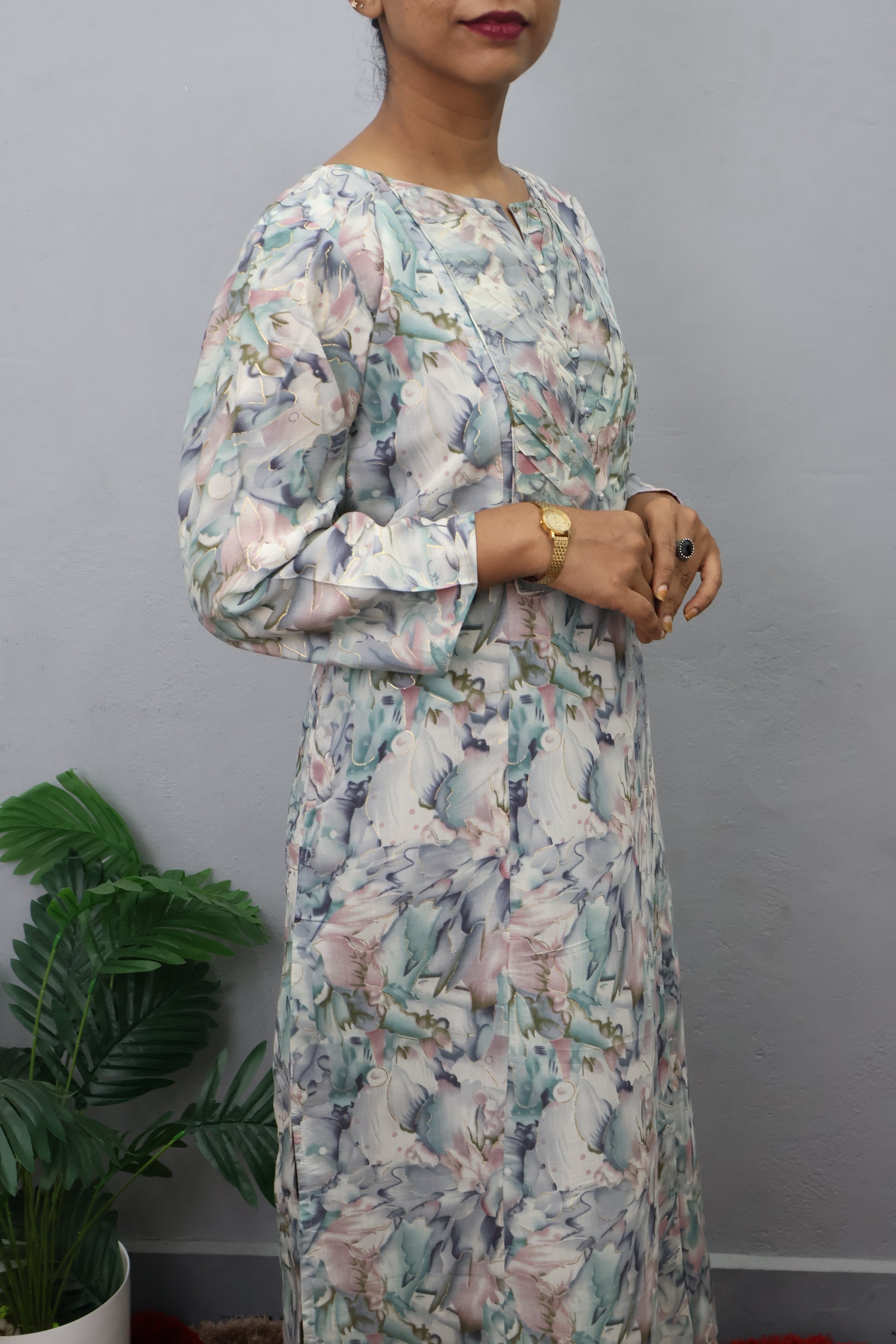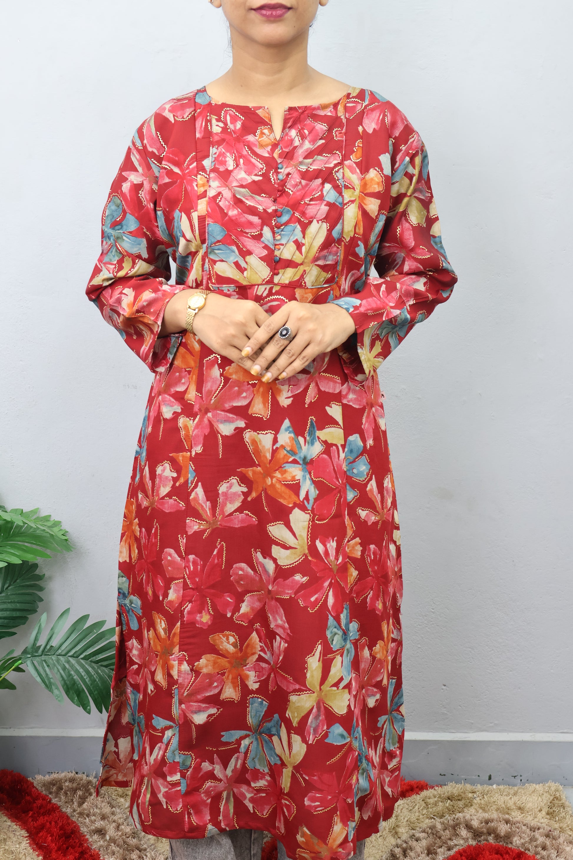 A vibrant red floral printed kurta crafted from soft, breathable fabric for all-day comfort. Its rich tones and elegant silhouette make it perfect for casual outings or festive gatherings.