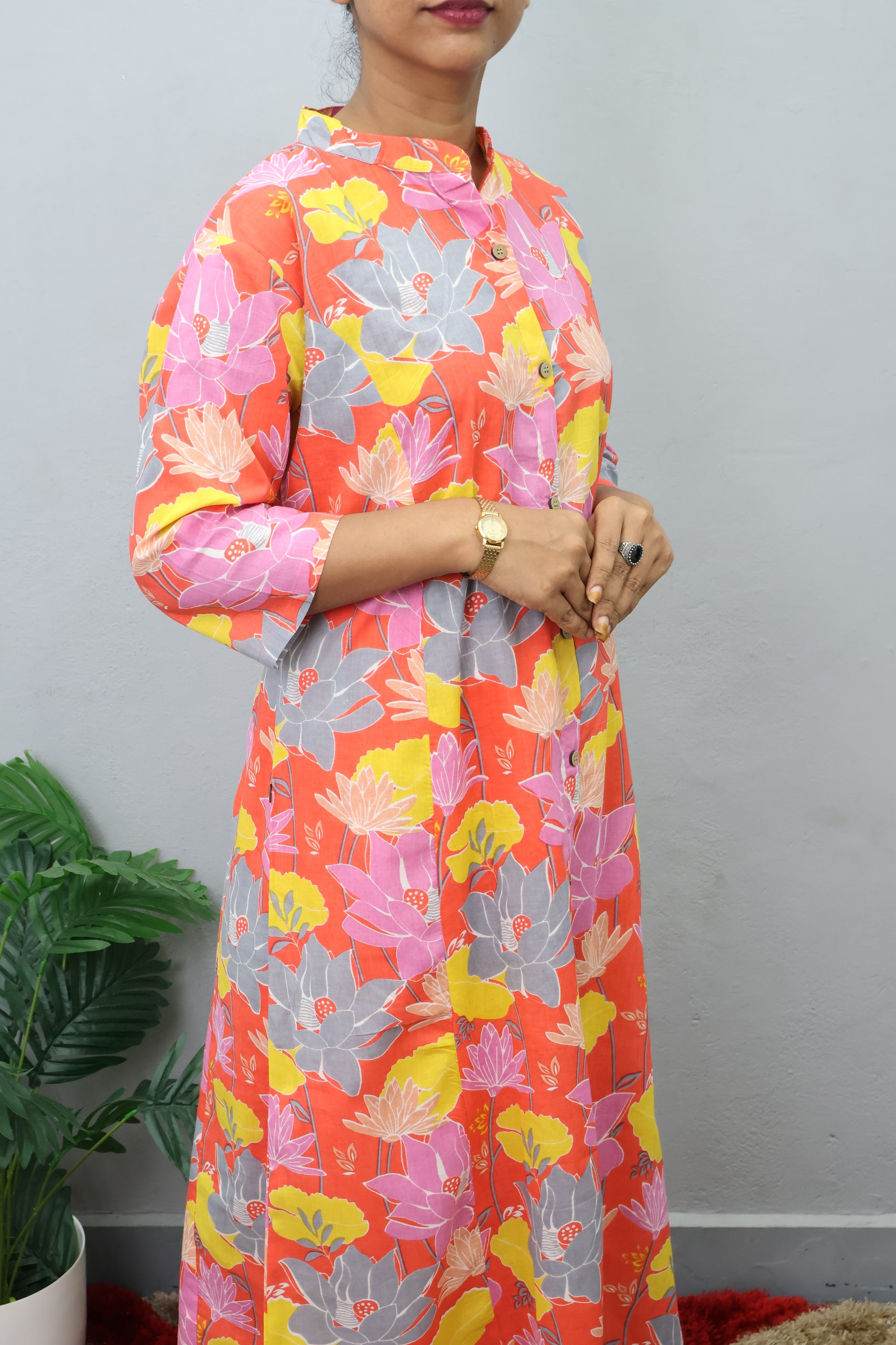 Colour: Multicolour floral print (orange, pink, yellow, and grey tones)