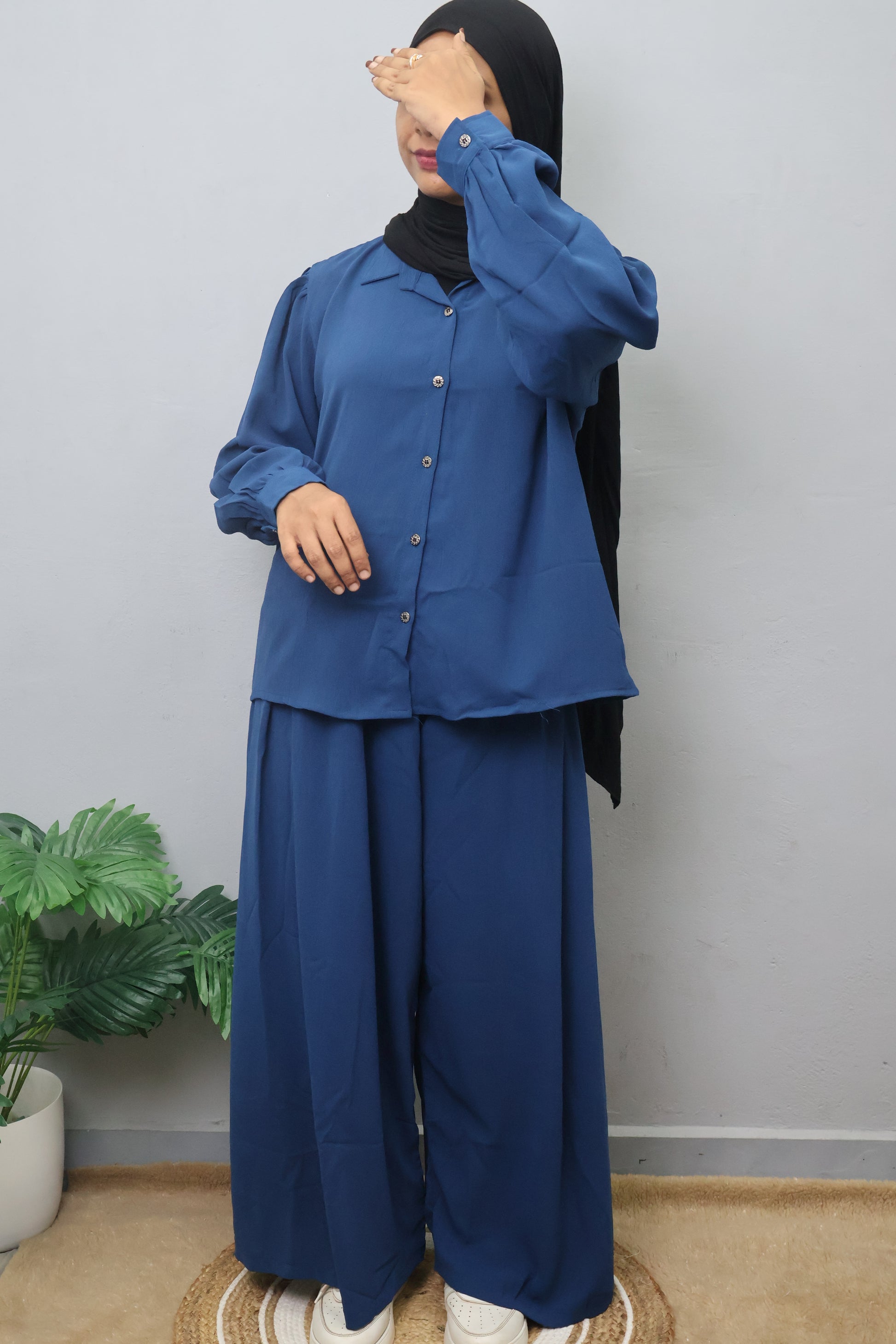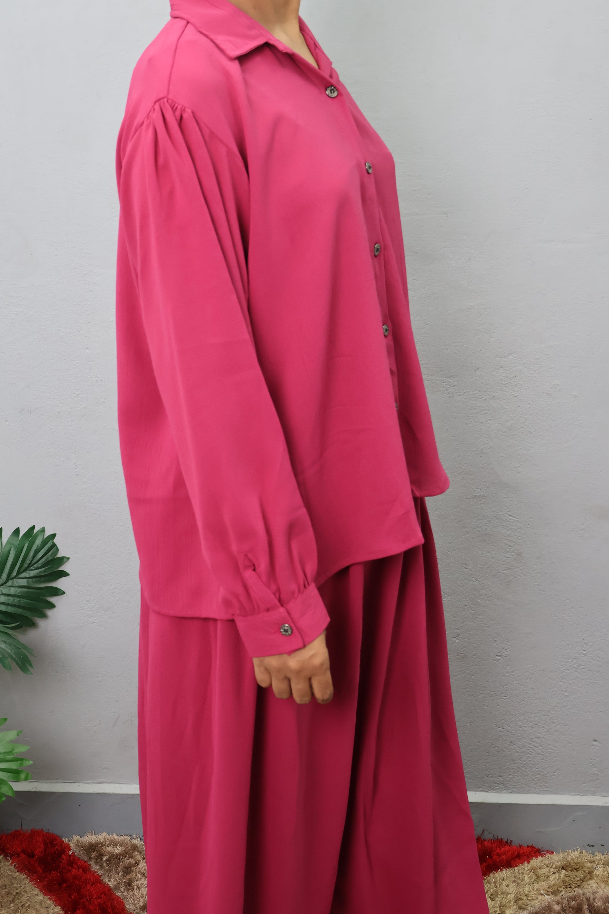 A relaxed mauve co-ord set featuring a button-down shirt with soft gathers at the sleeves and matching wide-leg pants. Designed for all-day comfort and effortless style, this outfit combines a flowy silhouette with a modern minimal look — perfect for casual outings, travel, or everyday wear.